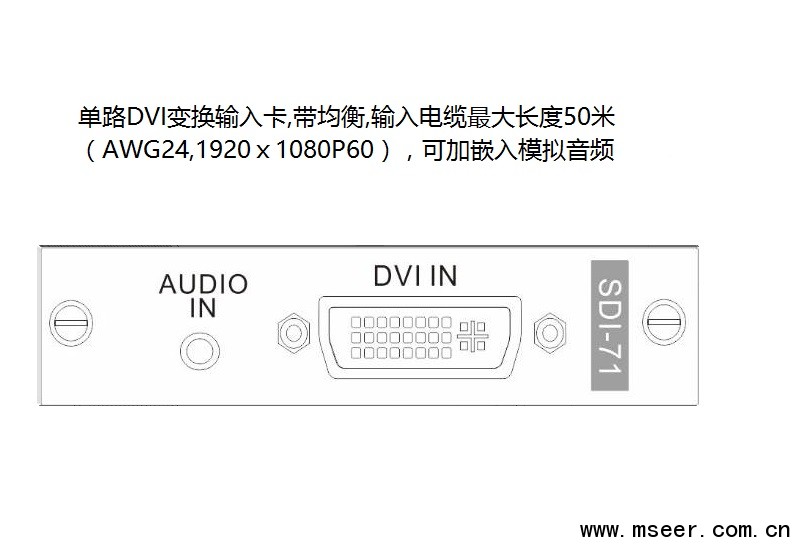 SDI-71 DVI 單通道變換輸入卡,配合SMD主機使用,采用獨立板卡設計,每塊卡支持1路DVI-D輸入,帶均衡,輸入電纜最大長度50米(AWG24,1920ⅹ1080P60),可加嵌入模擬音頻,支持最高1920x1200P60的數字高清圖像傳輸.