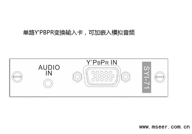 SYI-71 Y'PBPR單通道變換輸入卡,配合SMD主機使用,采用獨立板卡設計,每塊卡支持1路Y'PBPR輸入,可加嵌入模擬音頻,支持最高1920x1080P60的高清圖像傳輸.