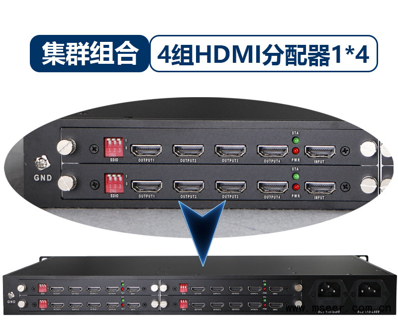 ●HDMI分配器將4組1分4的分配器基站組裝在一個標準機箱(1U)內,能將4路高清視頻,每路分別無損分配至4個視頻顯示設備;